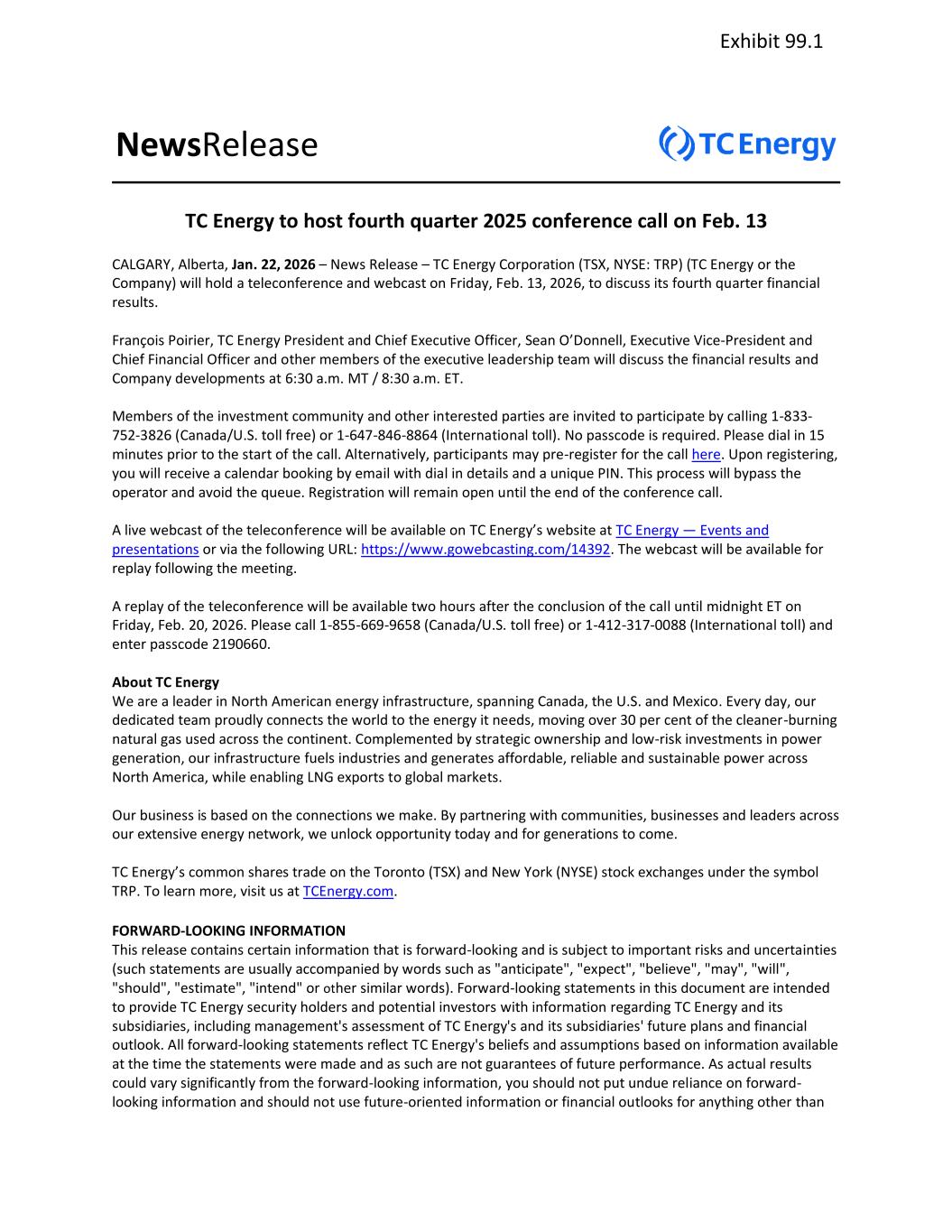 NewsRelease TC Energy to host fourth quarter 2025 conference call on Feb. 13 CALGARY, Alberta, Jan. 22, 2026 – News Release – TC Energy Corporation (TSX, NYSE: TRP) (TC Energy or the Company) will hold a teleconference and webcast on Friday, Feb. 13, 2026, to discuss its fourth quarter financial results. François Poirier, TC Energy President and Chief Executive Officer, Sean O’Donnell, Executive Vice-President and Chief Financial Officer and other members of the executive leadership team will discuss the financial results and Company developments at 6:30 a.m. MT / 8:30 a.m. ET. Members of the investment community and other interested parties are invited to participate by calling 1-833- 752-3826 (Canada/U.S. toll free) or 1-647-846-8864 (International toll). No passcode is required. Please dial in 15 minutes prior to the start of the call. Alternatively, participants may pre-register for the call here. Upon registering, you will receive a calendar booking by email with dial in details and a unique PIN. This process will bypass the operator and avoid the queue. Registration will remain open until the end of the conference call. A live webcast of the teleconference will be available on TC Energy’s website at TC Energy — Events and presentations or via the following URL: https://www.gowebcasting.com/14392. The webcast will be available for replay following the meeting. A replay of the teleconference will be available two hours after the conclusion of the call until midnight ET on Friday, Feb. 20, 2026. Please call 1-855-669-9658 (Canada/U.S. toll free) or 1-412-317-0088 (International toll) and enter passcode 2190660. About TC Energy We are a leader in North American energy infrastructure, spanning Canada, the U.S. and Mexico. Every day, our dedicated team proudly connects the world to the energy it needs, moving over 30 per cent of the cleaner-burning natural gas used across the continent. Complemented by strategic ownership and low-risk investments in power generation, our infrastructure fuels industries and generates affordable, reliable and sustainable power across North America, while enabling LNG exports to global markets. Our business is based on the connections we make. By partnering with communities, businesses and leaders across our extensive energy network, we unlock opportunity today and for generations to come. TC Energy’s common shares trade on the Toronto (TSX) and New York (NYSE) stock exchanges under the symbol TRP. To learn more, visit us at TCEnergy.com. FORWARD-LOOKING INFORMATION This release contains certain information that is forward-looking and is subject to important risks and uncertainties (such statements are usually accompanied by words such as "anticipate", "expect", "believe", "may", "will", "should", "estimate", "intend" or other similar words). Forward-looking statements in this document are intended to provide TC Energy security holders and potential investors with information regarding TC Energy and its subsidiaries, including management's assessment of TC Energy's and its subsidiaries' future plans and financial outlook. All forward-looking statements reflect TC Energy's beliefs and assumptions based on information available at the time the statements were made and as such are not guarantees of future performance. As actual results could vary significantly from the forward-looking information, you should not put undue reliance on forward- looking information and should not use future-oriented information or financial outlooks for anything other than Exhibit 99.1