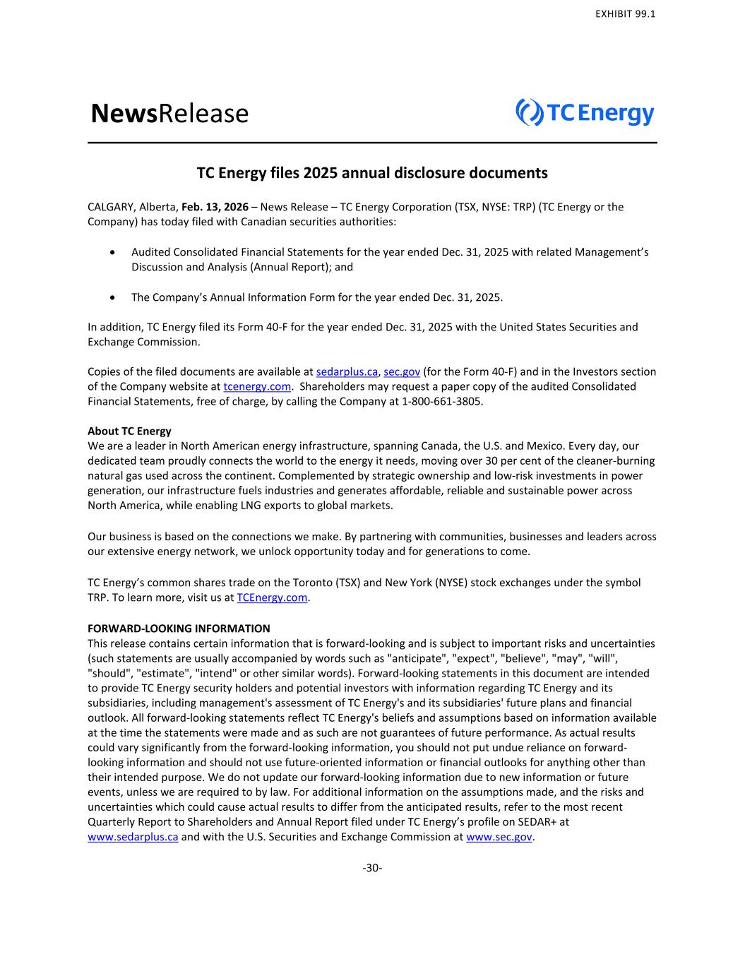 NewsRelease TC Energy files 2025 annual disclosure documents CALGARY, Alberta, Feb. 13, 2026 – News Release – TC Energy Corporation (TSX, NYSE: TRP) (TC Energy or the Company) has today filed with Canadian securities authorities: • Audited Consolidated Financial Statements for the year ended Dec. 31, 2025 with related Management’s Discussion and Analysis (Annual Report); and • The Company’s Annual Information Form for the year ended Dec. 31, 2025. In addition, TC Energy filed its Form 40-F for the year ended Dec. 31, 2025 with the United States Securities and Exchange Commission. Copies of the filed documents are available at sedarplus.ca, sec.gov (for the Form 40-F) and in the Investors section of the Company website at tcenergy.com. Shareholders may request a paper copy of the audited Consolidated Financial Statements, free of charge, by calling the Company at 1-800-661-3805. About TC Energy We are a leader in North American energy infrastructure, spanning Canada, the U.S. and Mexico. Every day, our dedicated team proudly connects the world to the energy it needs, moving over 30 per cent of the cleaner-burning natural gas used across the continent. Complemented by strategic ownership and low-risk investments in power generation, our infrastructure fuels industries and generates affordable, reliable and sustainable power across North America, while enabling LNG exports to global markets. Our business is based on the connections we make. By partnering with communities, businesses and leaders across our extensive energy network, we unlock opportunity today and for generations to come. TC Energy’s common shares trade on the Toronto (TSX) and New York (NYSE) stock exchanges under the symbol TRP. To learn more, visit us at TCEnergy.com. FORWARD-LOOKING INFORMATION This release contains certain information that is forward-looking and is subject to important risks and uncertainties (such statements are usually accompanied by words such as "anticipate", "expect", "believe", "may", "will", "should", "estimate", "intend" or other similar words). Forward-looking statements in this document are intended to provide TC Energy security holders and potential investors with information regarding TC Energy and its subsidiaries, including management's assessment of TC Energy's and its subsidiaries' future plans and financial outlook. All forward-looking statements reflect TC Energy's beliefs and assumptions based on information available at the time the statements were made and as such are not guarantees of future performance. As actual results could vary significantly from the forward-looking information, you should not put undue reliance on forward- looking information and should not use future-oriented information or financial outlooks for anything other than their intended purpose. We do not update our forward-looking information due to new information or future events, unless we are required to by law. For additional information on the assumptions made, and the risks and uncertainties which could cause actual results to differ from the anticipated results, refer to the most recent Quarterly Report to Shareholders and Annual Report filed under TC Energy’s profile on SEDAR+ at www.sedarplus.ca and with the U.S. Securities and Exchange Commission at www.sec.gov. -30- EXHIBIT 99.1